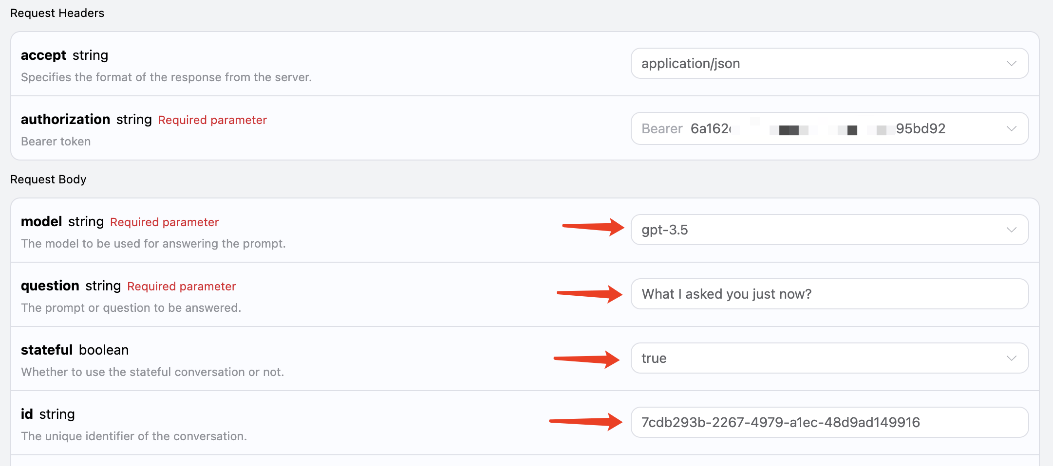 payload = { "model": "gpt-3.5", "stateful": True, "id": "7cdb293b-2267-4979-a1ec-48d9ad149916", "question": "Hello" }