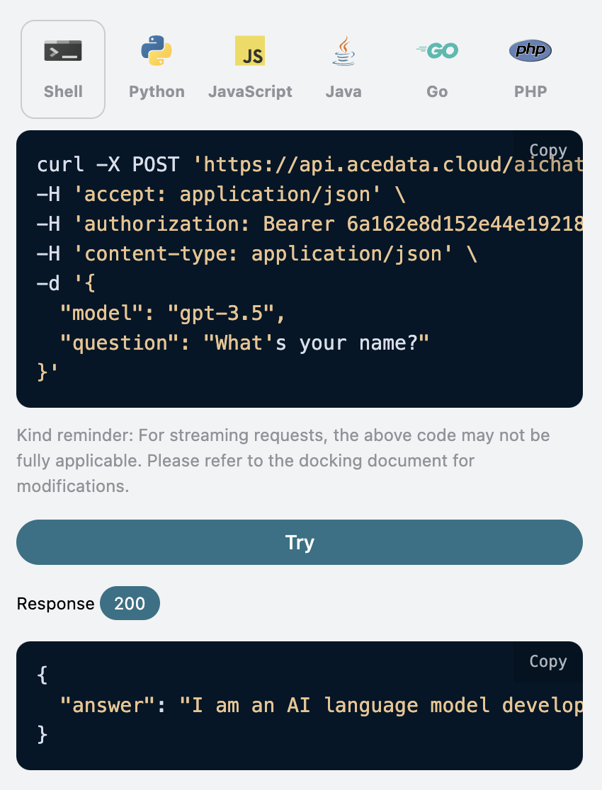AceDataCloud 提供的 AI 问答 API 针对上述情况进行了优化,在保证问答效果不变的情况下,对连续对话的实现进行了封装,对接时无需再关心 messages 的传递,也无需关心 Token 超出限制的问题(API 内部自动进行了处理),同时也提供了对话查询、修改等功能,使得整体的对接大大简化。