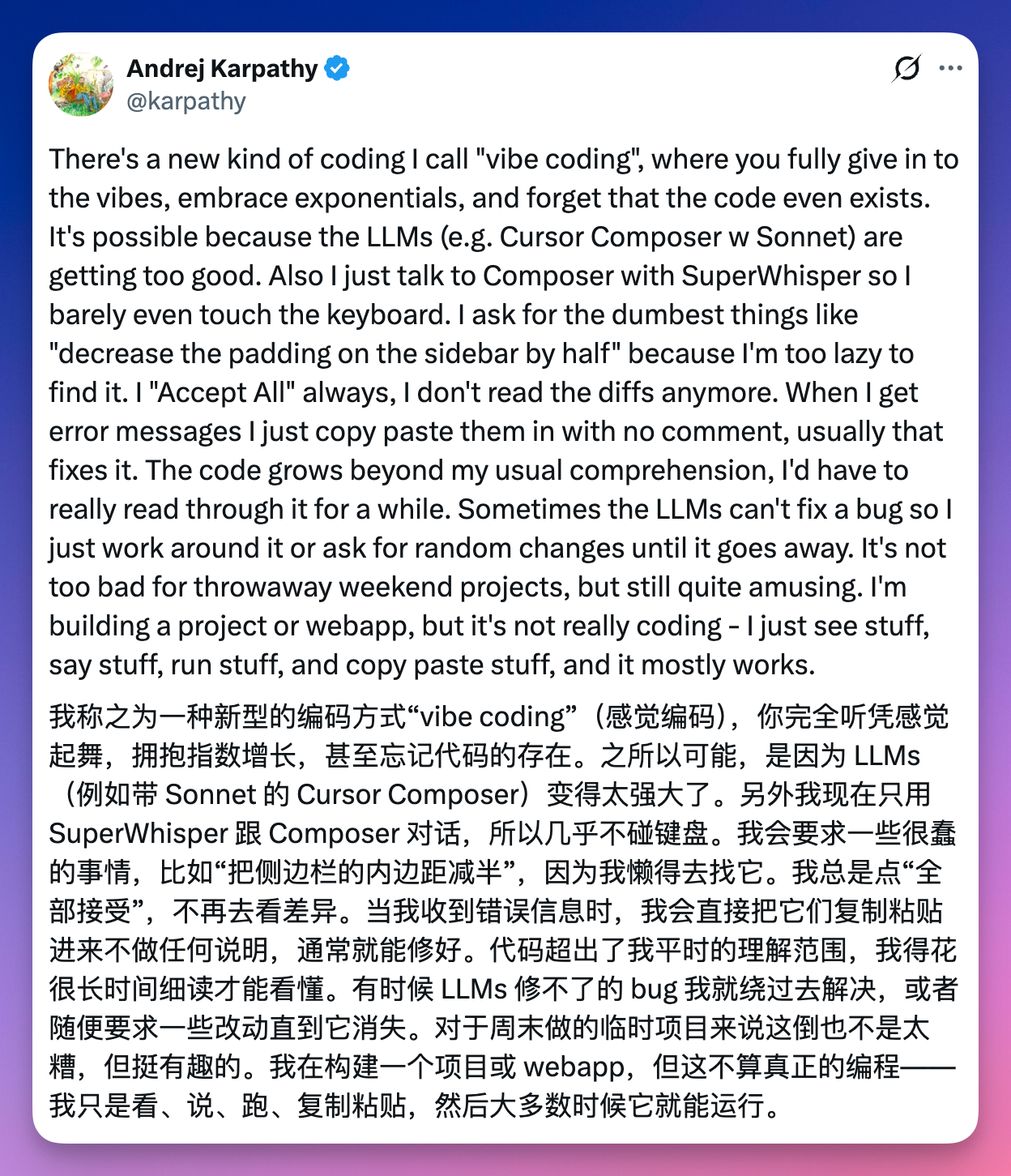 「有一种新的编程方式,我称之为 vibe coding。你完全跟着感觉走,拥抱指数级增长,甚至忘记代码的存在。」