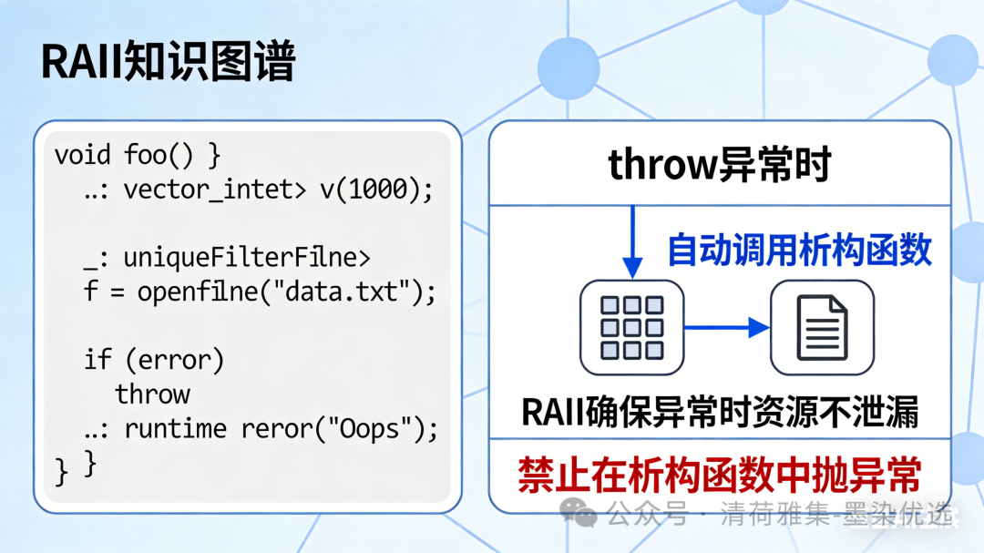 void foo() {std::vector<int> v(1000); // 自动管理内存std::unique_ptr<File> f = open_file("data.txt"); // 自动关闭// 即使 throw,v 和 f 也会正确析构!if (error) throw std::runtime_error("Oops");}