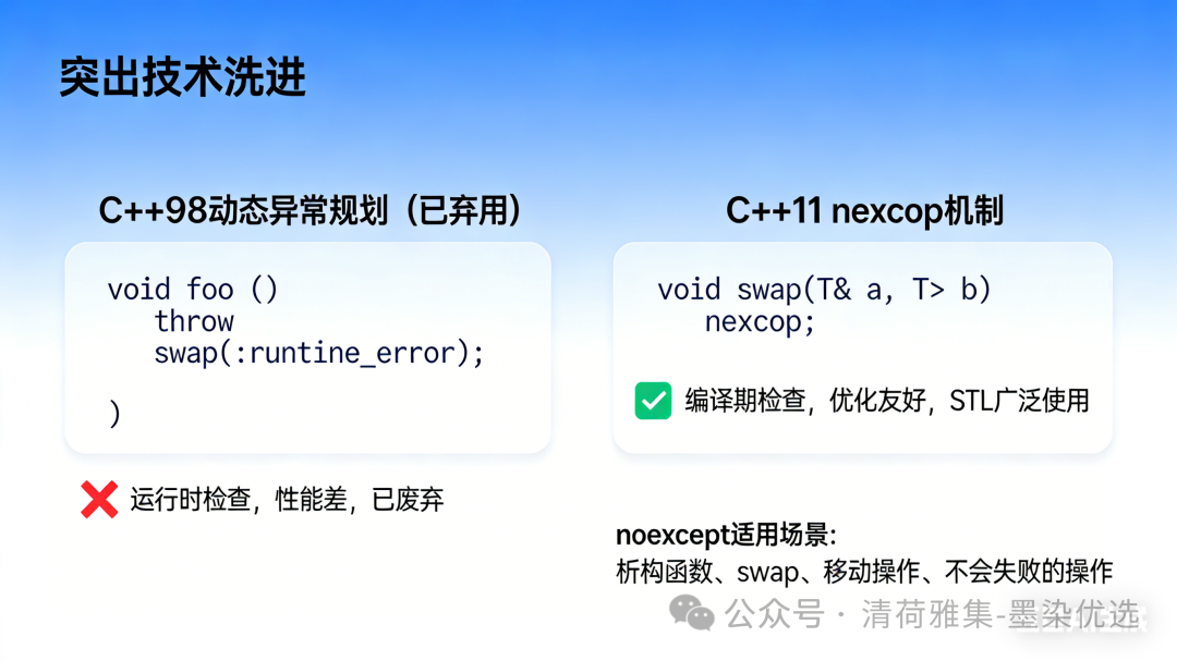 编译期检查:若noexcept函数抛出异常 →std::terminate