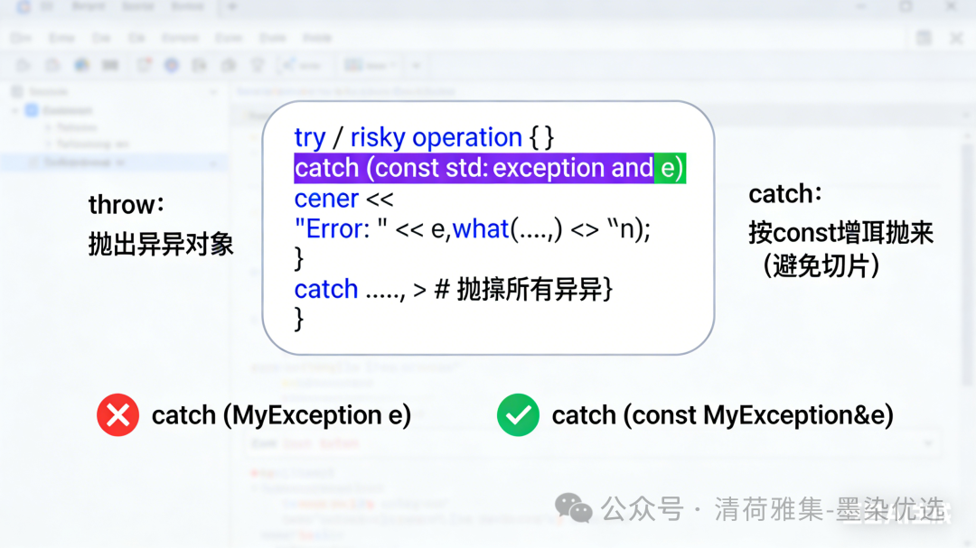 catch (const MyException& e) // 正确catch (MyException e) // 错误:不必要的拷贝 + 切片风险