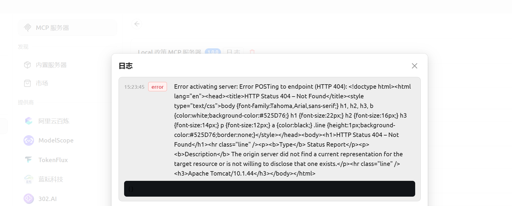 Error activating server:Error POSTing to endpoint (HTTP 404): <!doctype html><htmllang="en"><head><title>HTTP Status 404-Not Found</title><styletype="text/css">body {Font-family:Tahoma,Arial,sans-serif;} h1,h2, h3,b{color:white;background-color:#525D76:} h1 {Font-size:22px;} h2 {font-size:16px;}h3{Font-size:14px;} p {font-size:12px;} a {color:black;}.line {height:1px;background-color:#525D76;border:none;}</style></head><body><h1>HTTP Status 404-NotFound</h1><hr class="line"/><p><b>Type</b> Status Report</p><p><b>Description</b> The origin server did not find a current representation For thetarget resource or is not willing to disclose that one exists.</p><hr class="line"/><h3>Apache Tomcat/10.1.44</h3></body></html>