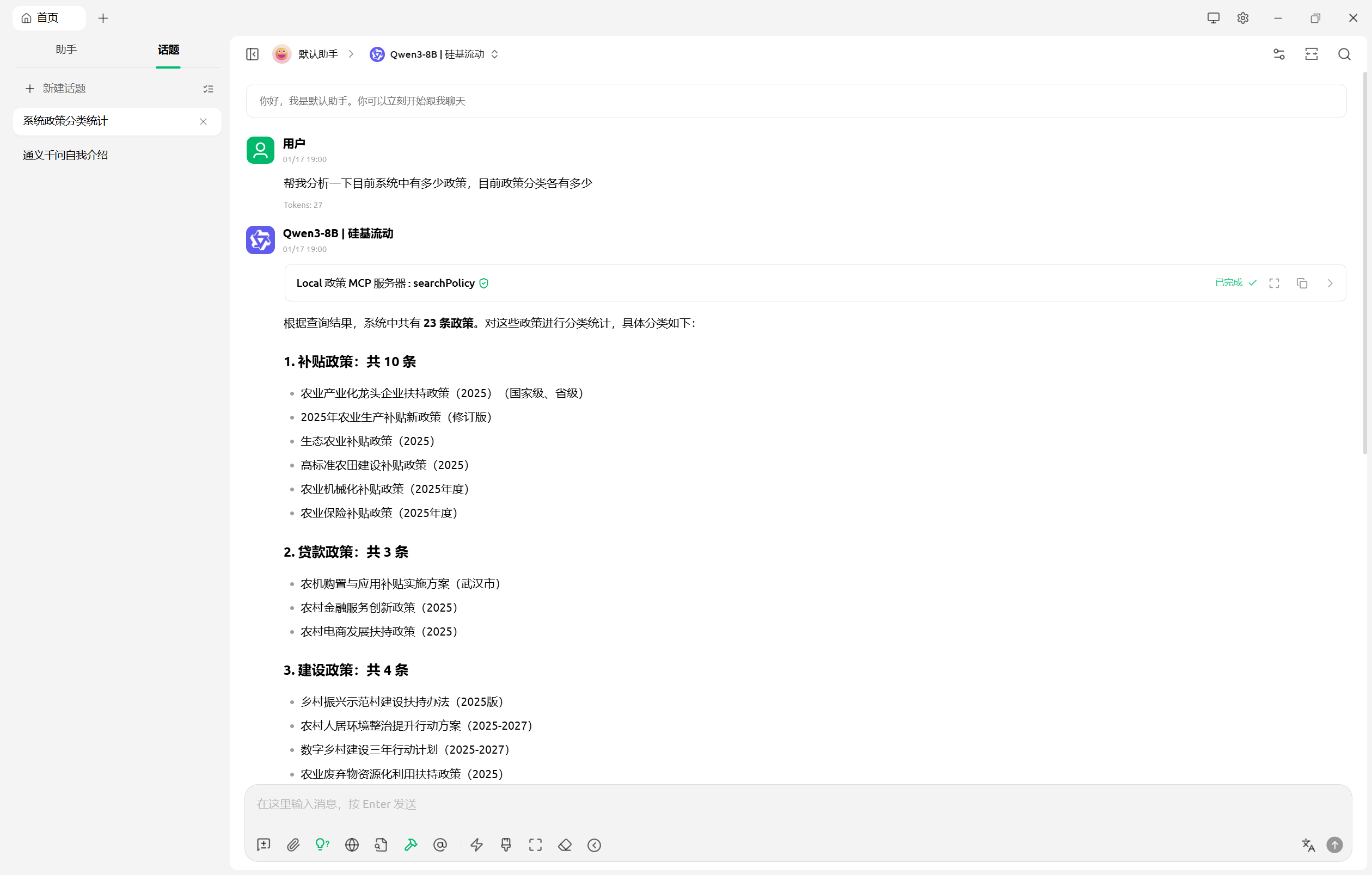 @McpTool(description = "回答关于政策的问题。根据用户的问题,从政策库中搜索相关政策和信息,提供准确的答案。支持询问政策内容、申请条件、适用范围等问题。")