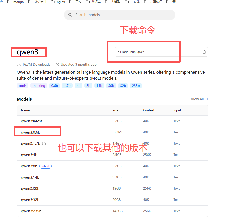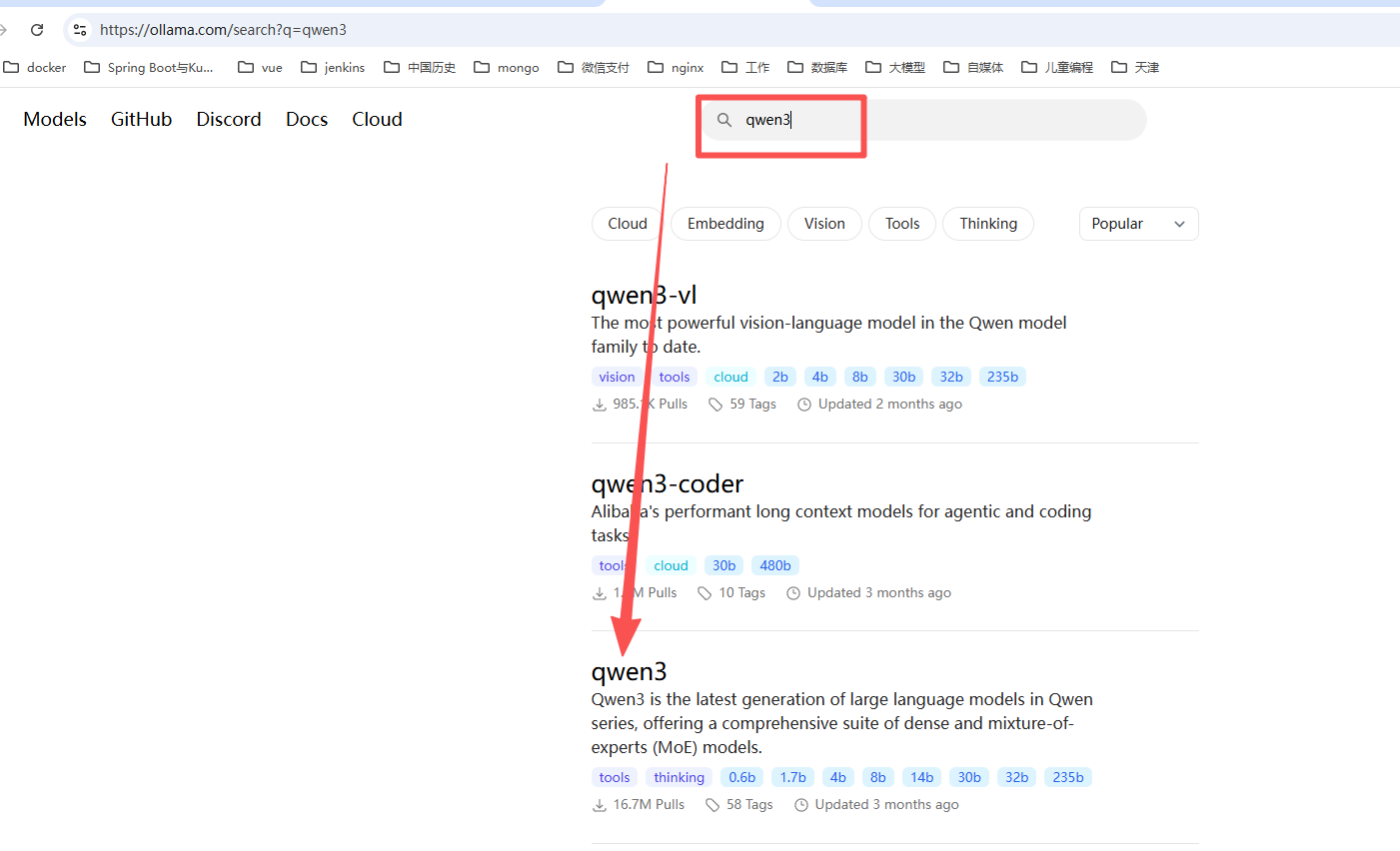 登录ollama官网https://ollama.com/,搜索自己想要的模型名字。