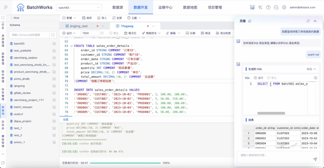 灵瞳智能体所对应的,是最靠近数据底座的一层能力。它面向的是数据开发与运维过程中最重、最专业的环节,通过自然语言与上下文理解,协助完成 SQL 编写与优化、日志诊断、任务排错等工作。在体系中,它的价值并不仅是“提高开发效率”,而是在为后续“一句话执行任务”奠定基础——当数据处理本身可以被 AI 稳定理解与执行,数据中台才有可能真正成为可调度的执行底座。