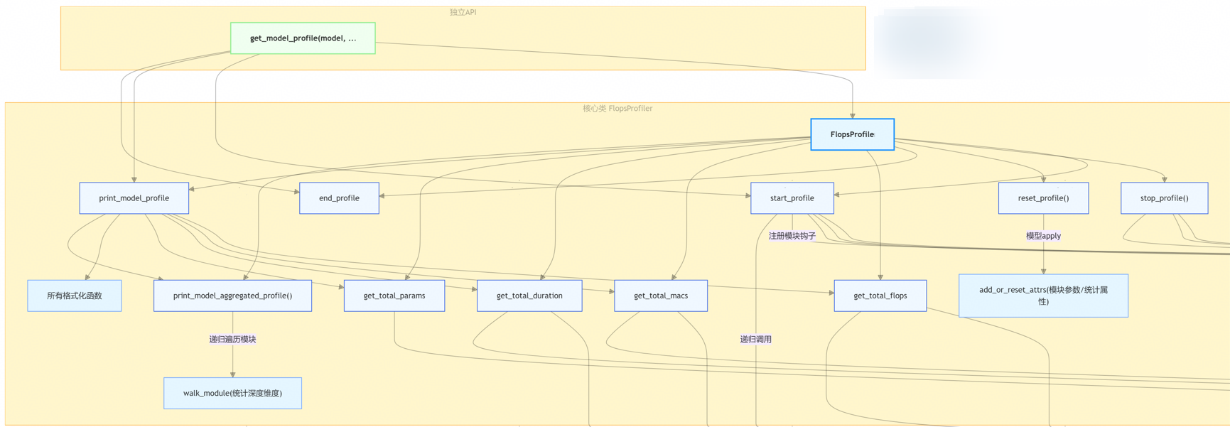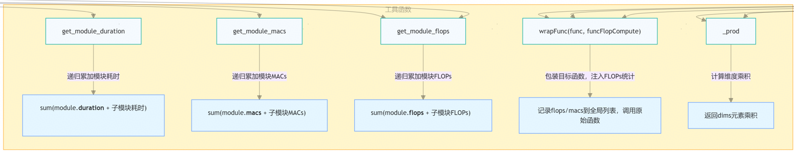各个核心工具类:递归地进行数据采集,核心数据包括:模块耗时duration、乘加次数macs、model_flops等。