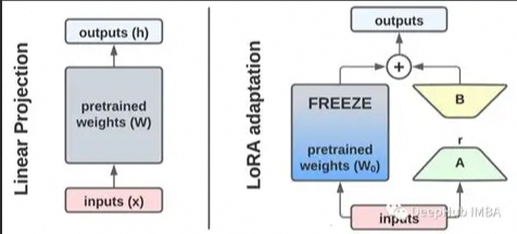 B ∈ R r × k B∈R^{r×k} B∈Rr×k:输出投影矩阵(初始化为 0); 其中 r 是低秩维度(通常取 8/16/32,远小于 d/k,如 d=4096 时 r=16)。