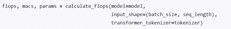 | calflops | 严格区分FLOPs和MACs,传入tokenizer作为transformer_tokenizer参数,形如: ![]() 推荐的三方库,Github链接,计算的FLOPs计算相对准确,使用方式便捷,主要适用于transformers模型实现。 |