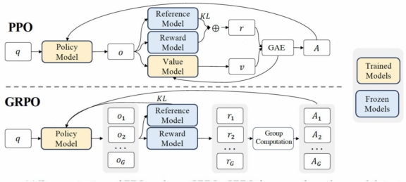 - GRPO REF模块:在RL场景,以去如下图GRPO算法为例,Ref参数模型和Rew奖励模型通常是冻结状态,因此在计算RL场景模型的model flops时也只需要考虑参数模型和奖励模型的前向。