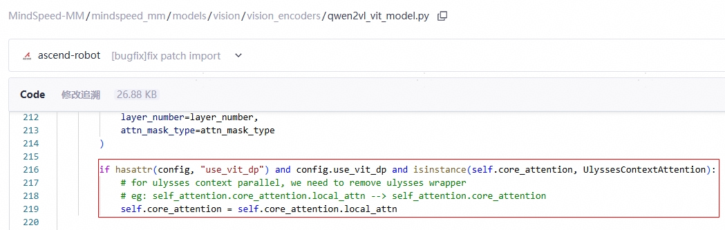 不管是Frame还是Windows,换一个角度都可以看做是dp视角的输入,将它们均匀划分到不同rank上独立运算,以实现并行提速。MindSpeed-MM仓中针对Qwen2.5VL ViT-DP的核心适配代码如下: