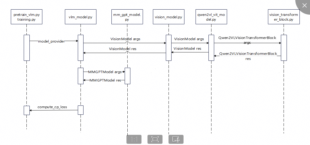 MindSpeed-MM VLM模型代码调用逻辑图如下所示,vlm_model.py文件中定义了模型主体结构(依次调用ViT、LLM,然后计算Loss):