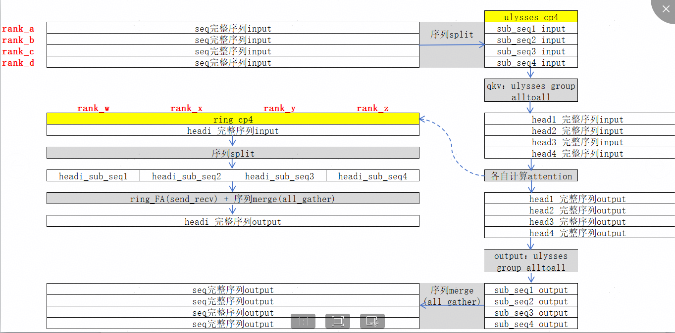 数据类型为BNSD,CP GROUP被分为两个维度(ring cp_group和ulysses cp_group),可以看做一个二维列表(ulysses对应列,ring对应行),例如cp_size8可以看做2×4,则ulysses cp_size为2,ring cp_size为4。 上表中alltoall可以表示为在特性维度上进行gather,在特定维度上进行scatter,例如ulysses前向过程会对seq维度进行gather、对应hc维度进行scatter(对应scatter_idx=1,gather_idx=2),反向过程则相反。