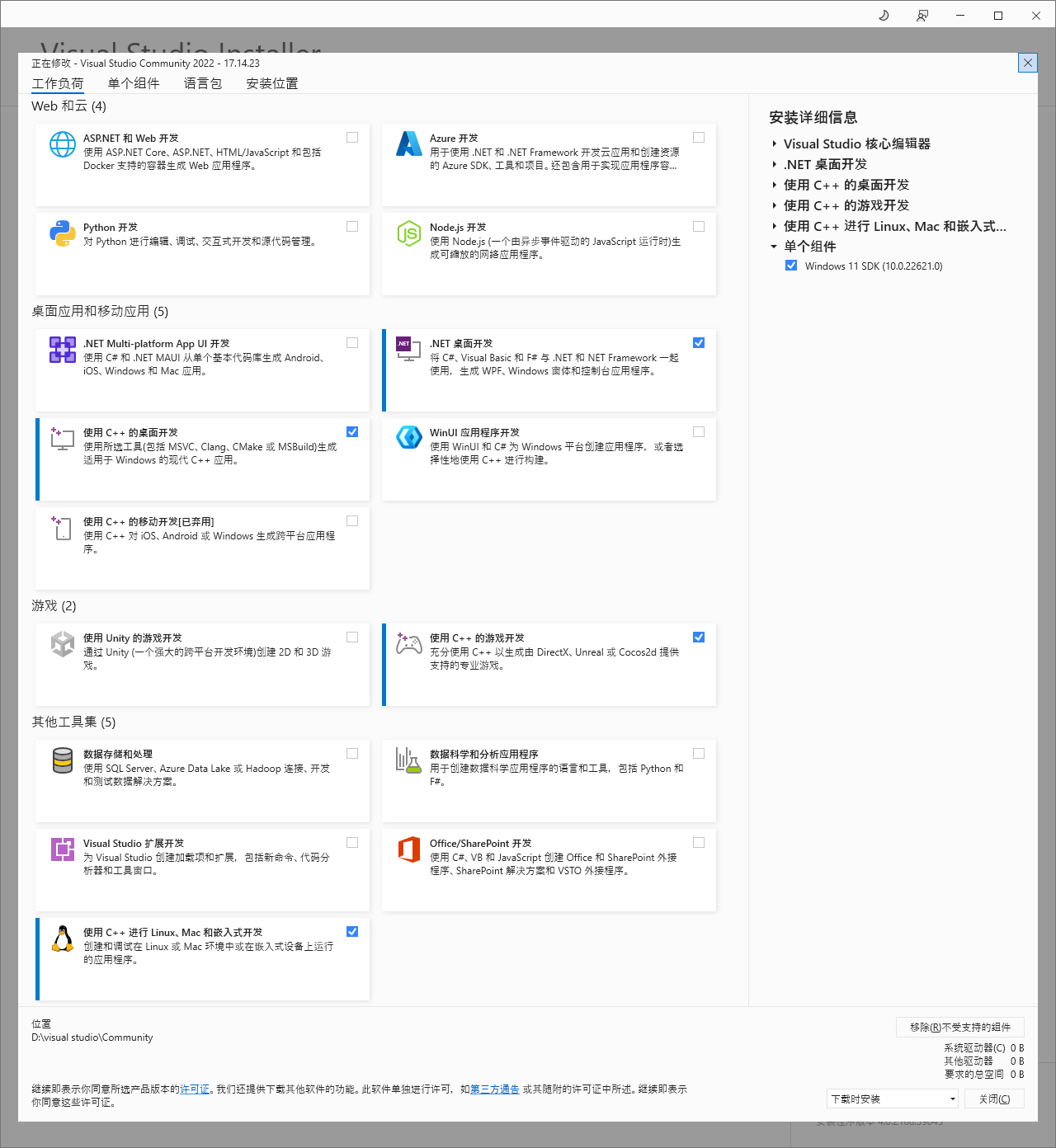 下载完成后,打开安装包进行安装,安装过程汇总需要手动选择一些组件来进行安装,工作负荷中勾选如下选项,如果是Windows10系统,需要在的那个组件中勾选“Windows 10 SDK”。安装完成后需要重新启动电脑。