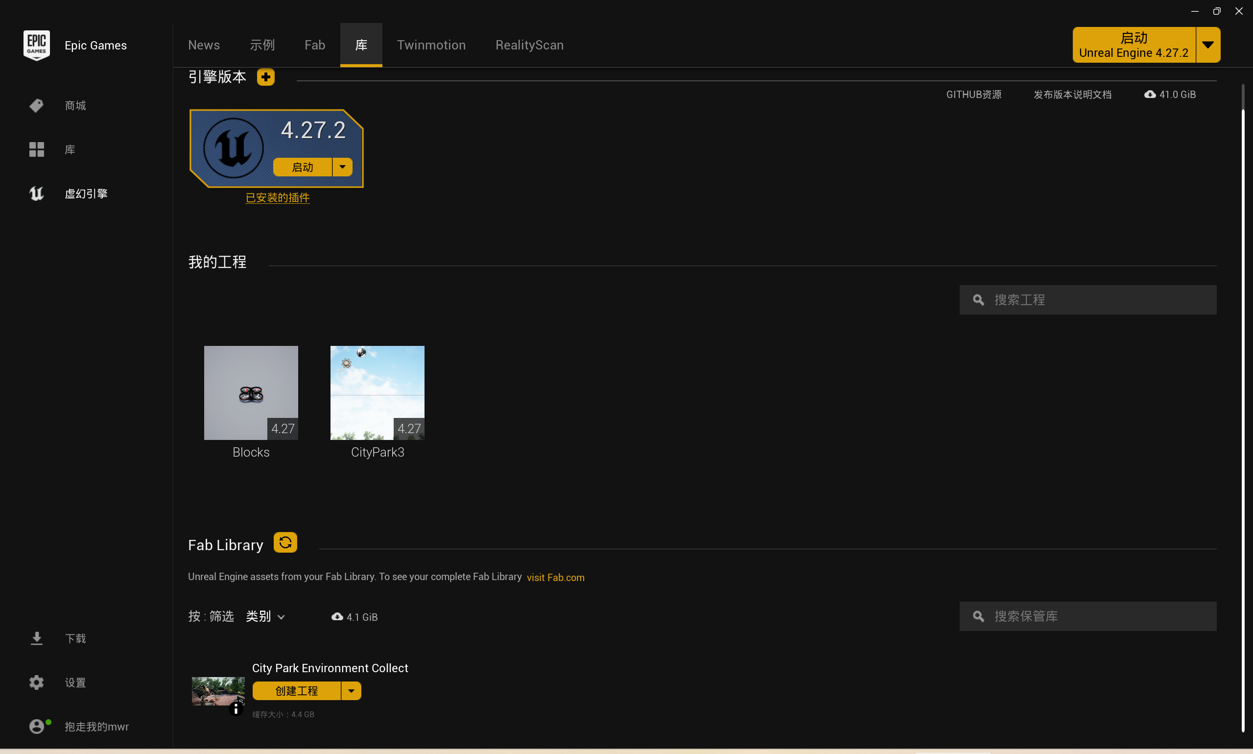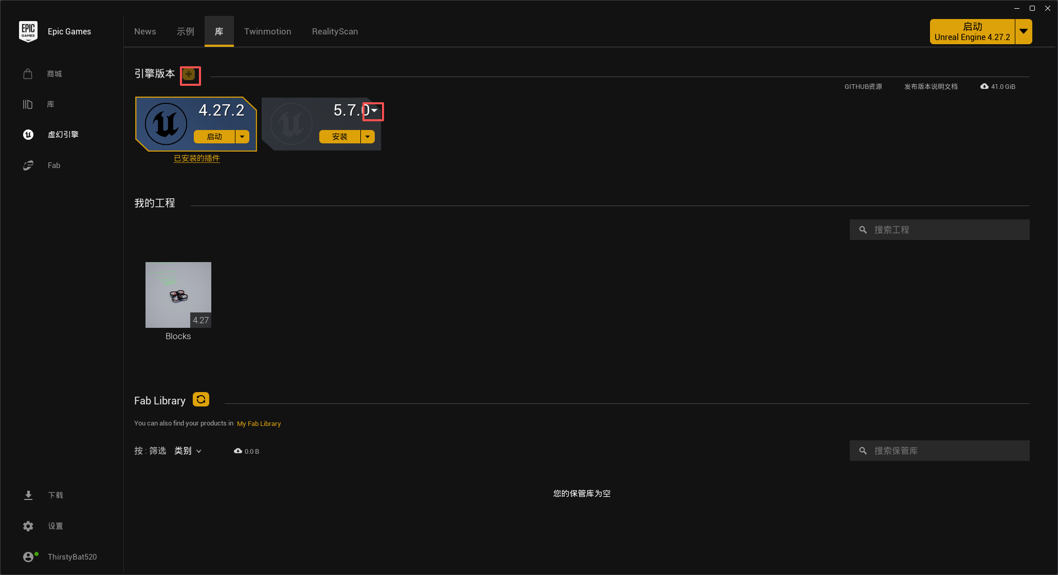右侧的 “引擎版本” 展示了当前电脑已经安装的虚幻引擎各版本;“我的工程” 展示的是当前已经创建的虚幻引擎工程文件;“保管库” 里面包括了当前已经从虚幻商城中购买和下载的所有场景,可以在 “保管库” 中快速创建新的项目, “保管库” 中同时允许删除或更新其中的场景,但不影响已经创建好的工程。 “保管库Fab Library” 中的 “创建工程” 是一个完整的工程文件, “添加到工程” 是一个外部资源,可以添加到我们已经创建好的工程中,“安装到工程” 是一个外部插件,可以安装到我们已经创建好的工程中。