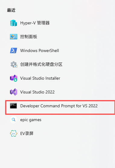 解压缩完成后需要通过VS 2022进行编译,在 Win11 开始菜单中找到并打开 “Developer Command Prompt for VS 2022”,或者也可以直接搜索