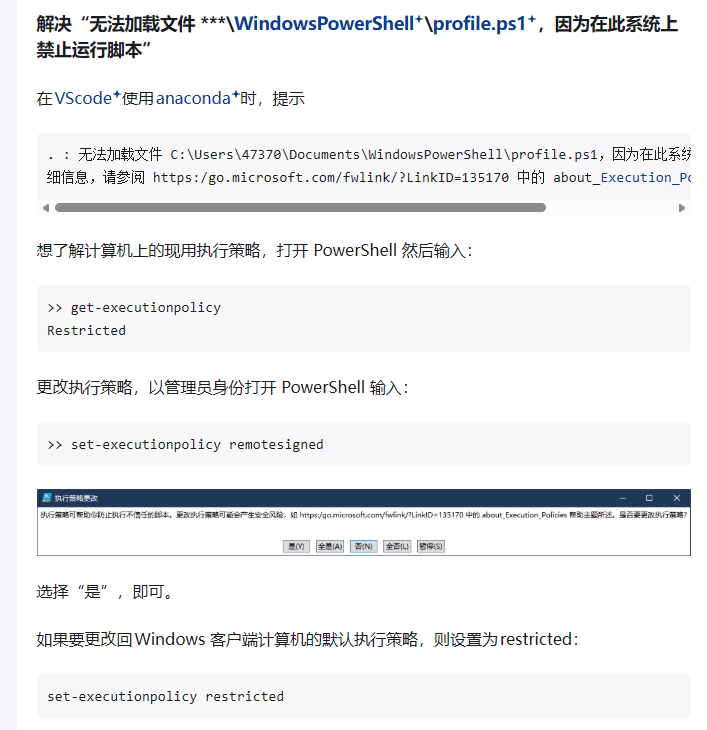 . : 无法加载文件 C:\Users\gyr\Documents\WindowsPowerShell\profile.ps1,因为在此系统上禁止运行脚本。有关详细信息,请参阅 https:/go.microsoft.com/fwlink/?LinkID=135170 中的 about_Execution_Policies。 所在位置 行:1 字符: 3 + . 'C:\Users\gyr\Documents\WindowsPowerShell\profile.ps1'