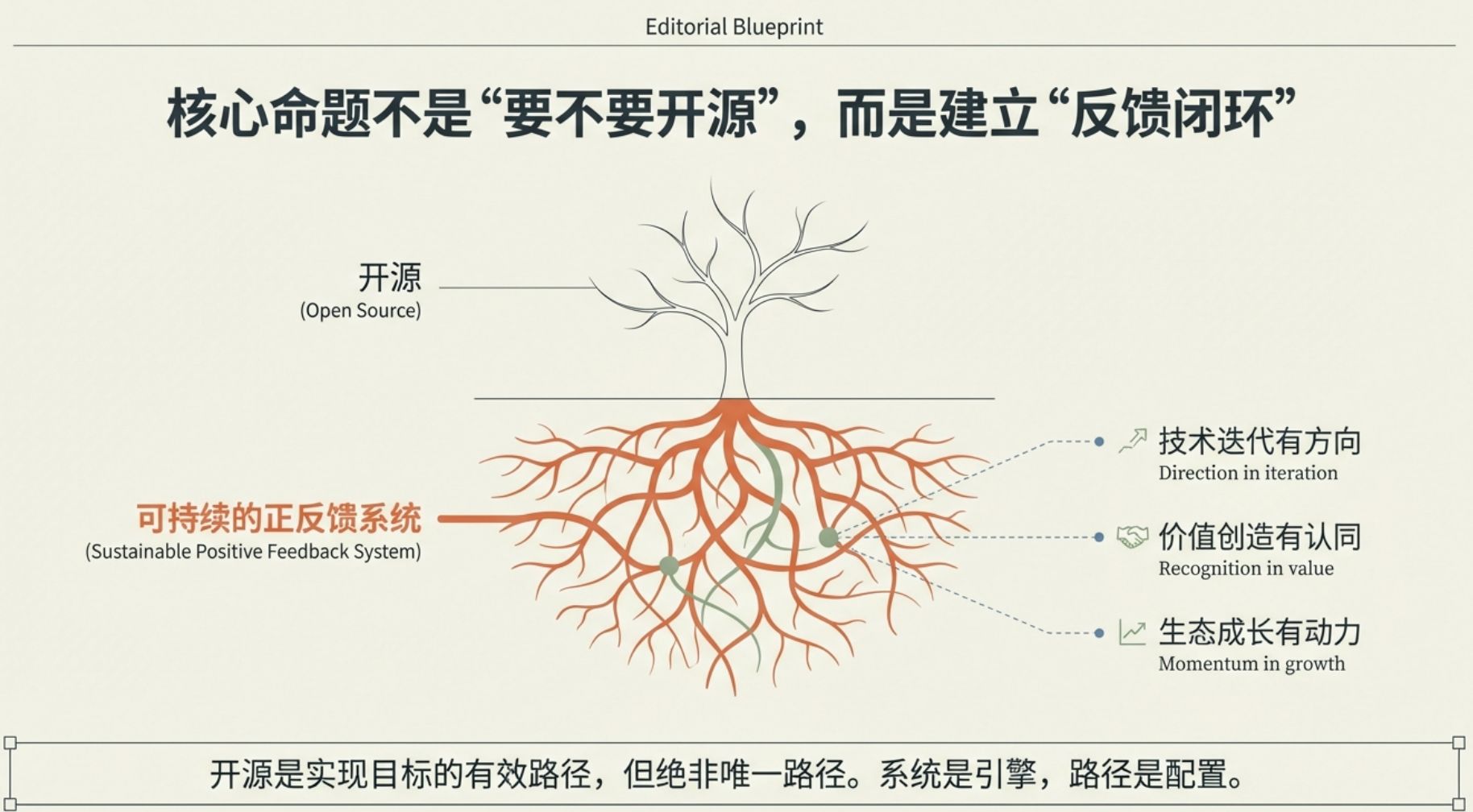 而破解这些困境的核心命题,从来不是 “要不要开源”,而是如何建立一套可持续的正反馈系统—— 让技术迭代有方向、价值创造有认同、生态成长有动力。开源是实现这一目标的有效路径,但绝非唯一路径。