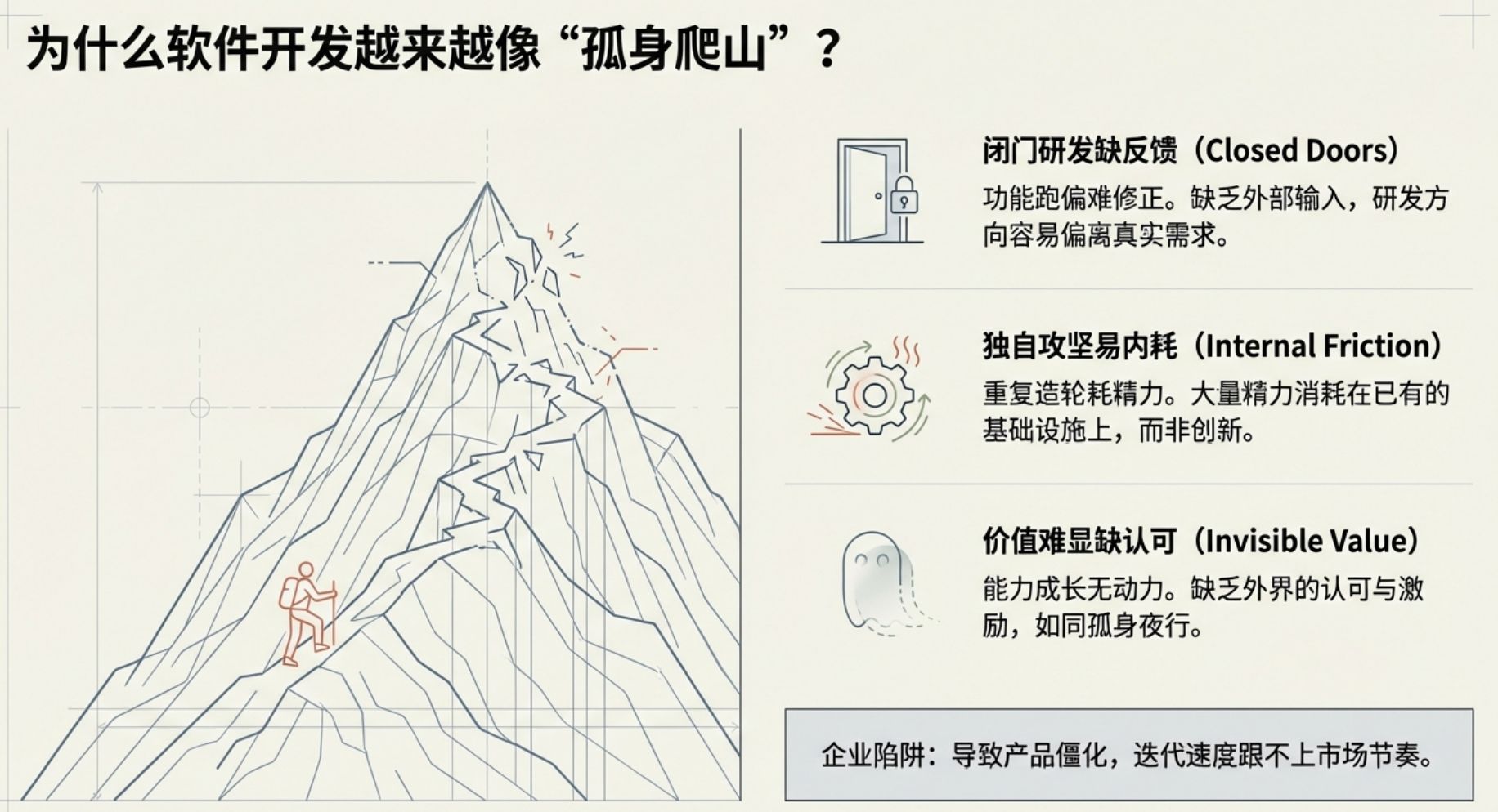 软件开发绕不开三大核心困境: 闭门研发缺反馈、功能跑偏难修正; 独自攻坚易内耗,重复造轮耗精力; 价值难显缺认可,能力成长无动力,如同孤身爬山,越走越累易半途而废。