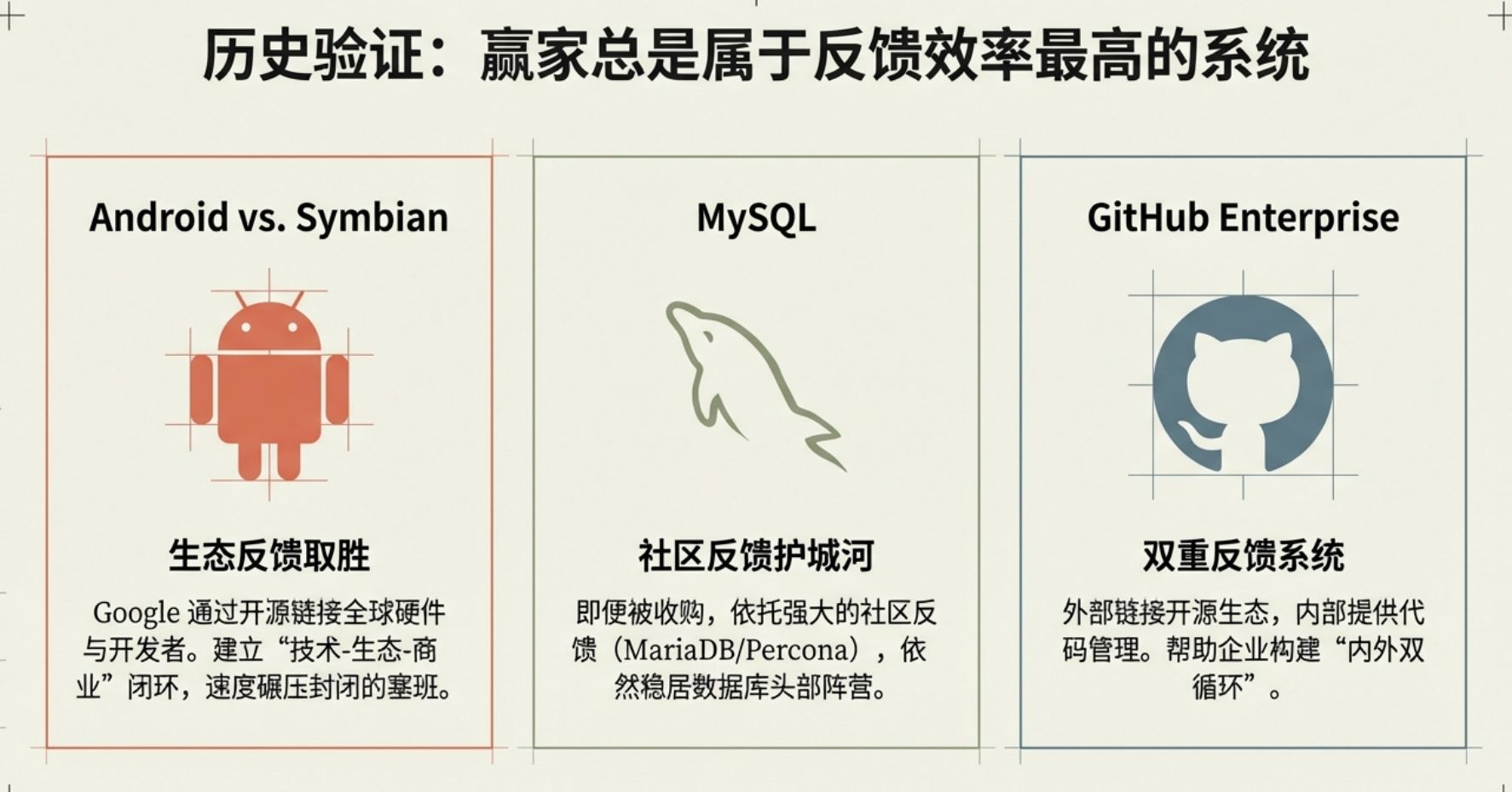 典型案例:Linux 内核依托开源生态,汇聚英特尔、红帽等企业的硬件适配能力,千万开发者的 bug 修复经验,从个人项目成长为支撑云计算、物联网的核心操作系统,正反馈循环持续数十年。