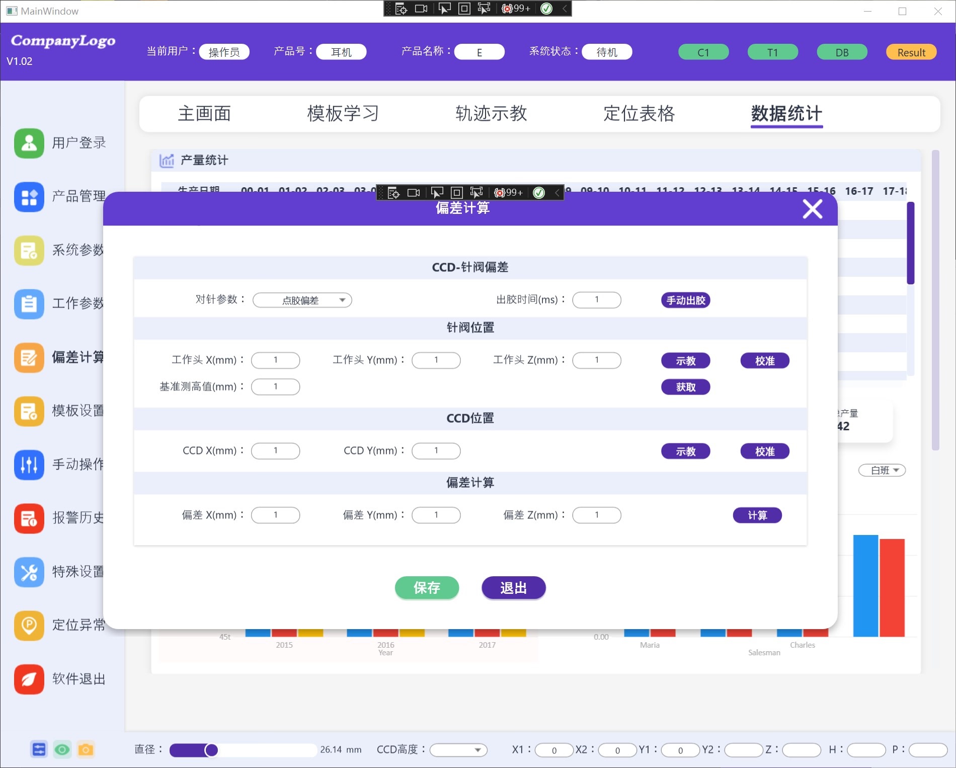 工控视觉项目桌面端WPF源码,UI源码,已实现前后端MVVM数据绑定。 除了两个柱状图用的第三...