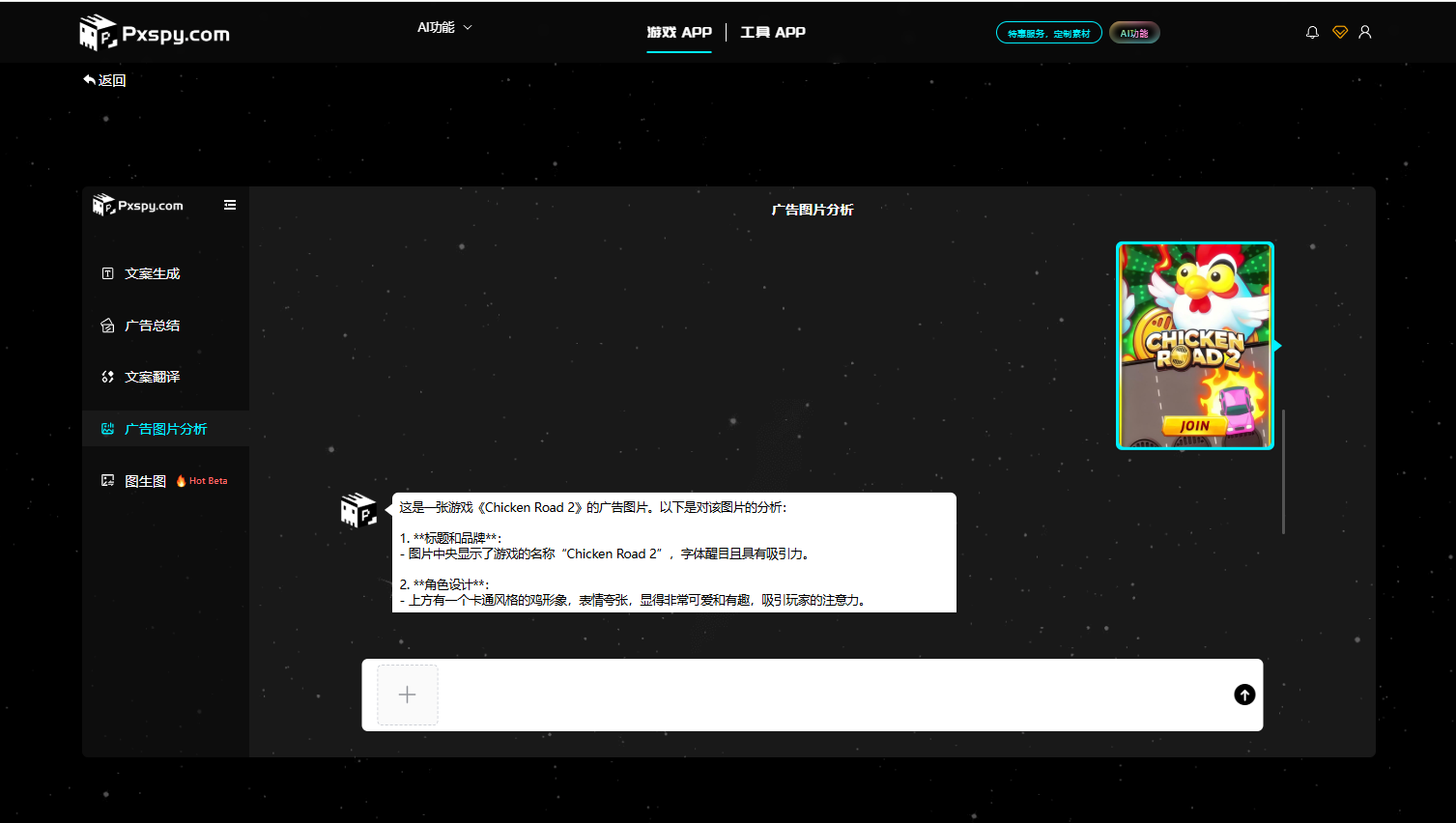 映像素材网(Pxspy)推出的广告图片分析功能,通过视觉元素识别、色彩分析、注意力热力图等维度,帮助投手科学解析爆款素材。该功能可快速诊断图片问题(如主体占比不足、色彩对比度低等),并提供针对性优化建议。实测案例显示,优化后的素材点击率提升42%,转化成本降低28%。该功能可与图生图等AI工具形成闭环,实现从竞品分析到创意生成的全流程数据驱动。