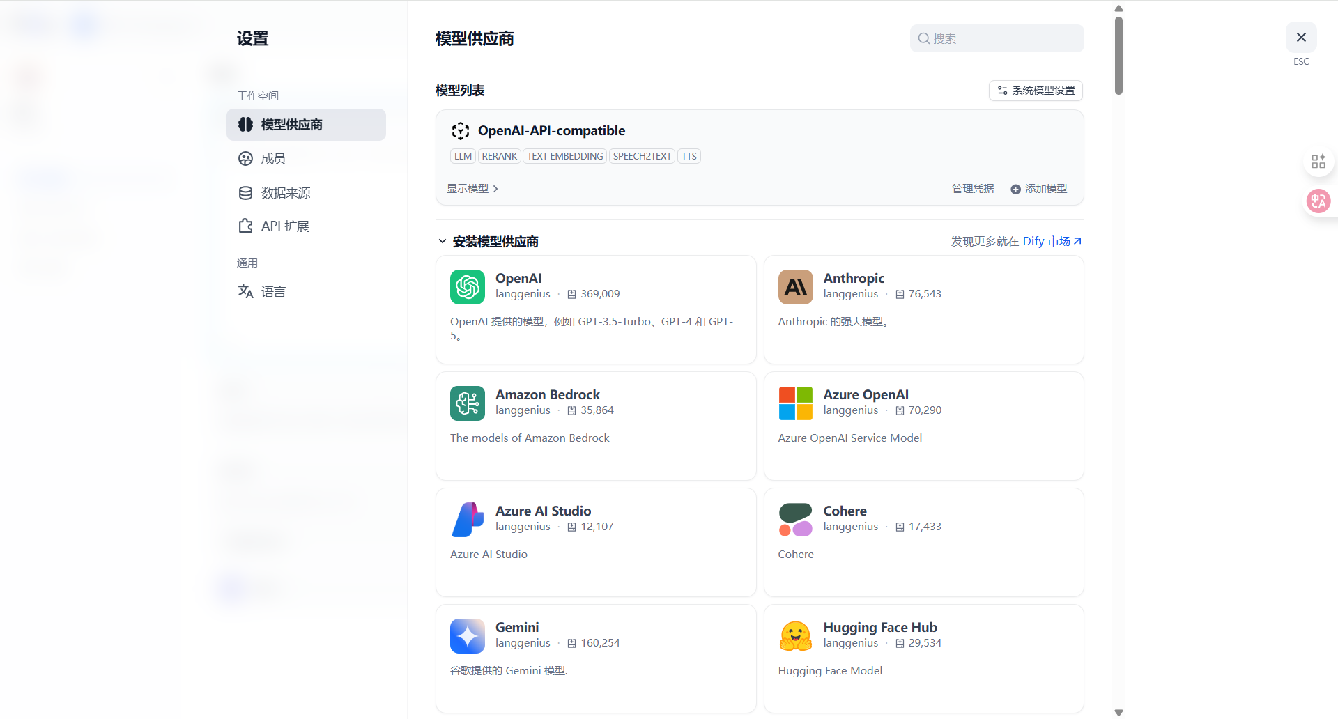 刚部署完在模型列表这里没有OpenAI-API-compatible,需要在下方的模型供应商中找到OpenAI-API-compatible进行安装