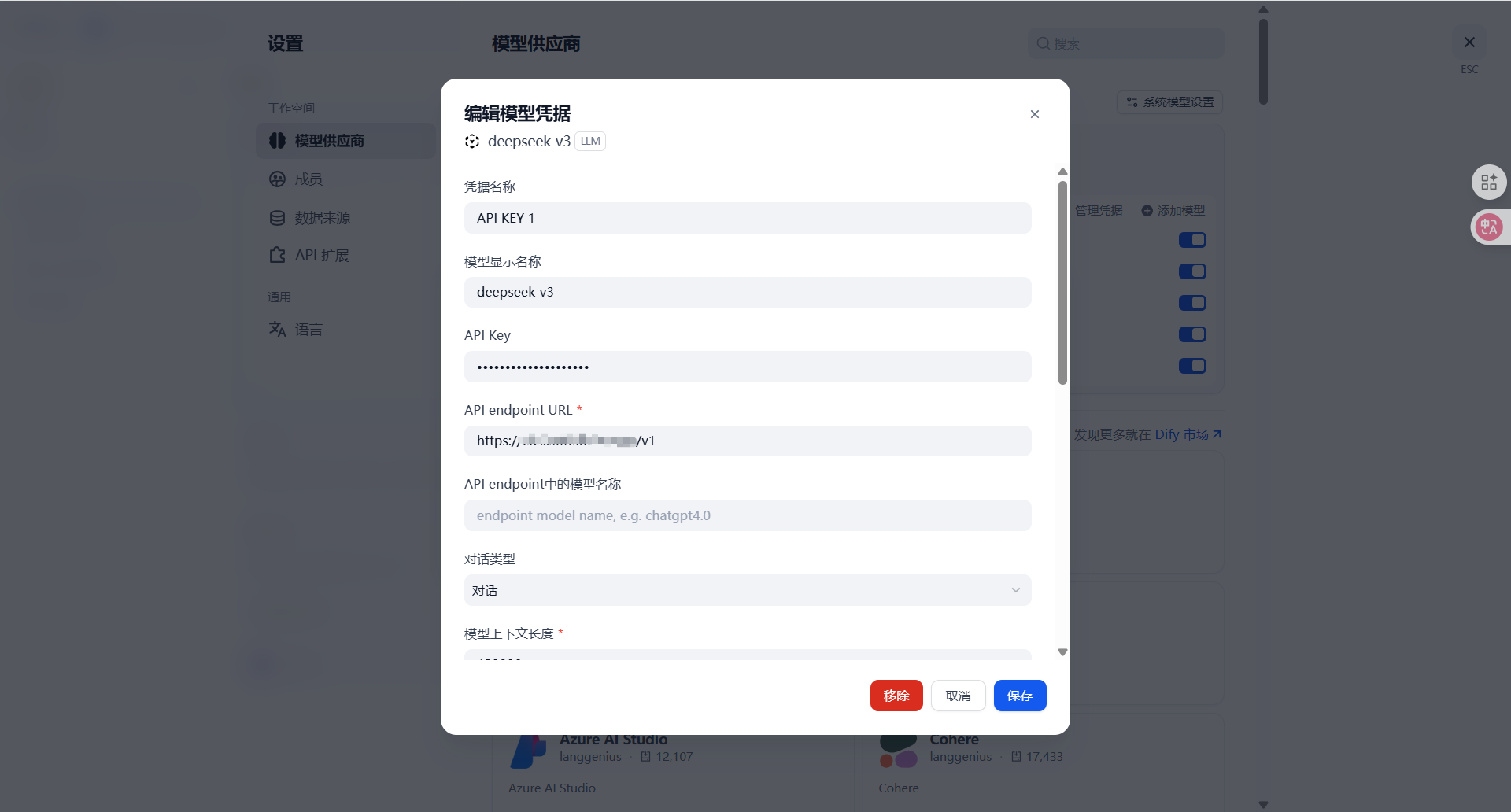 内网服务通常无鉴权(模型和dify在同一个机器上部署),但 Dify 前端校验不许为空。直接填 sk-123456 或任意字符占位即可。