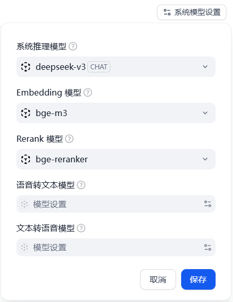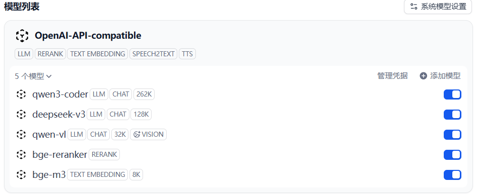 Rerank 能力:bge-reranker 被识别为 RERANK 类型。这是做高精度知识库检索的关键组件,很多教程忽略了这一点,导致 RAG 效果不佳。