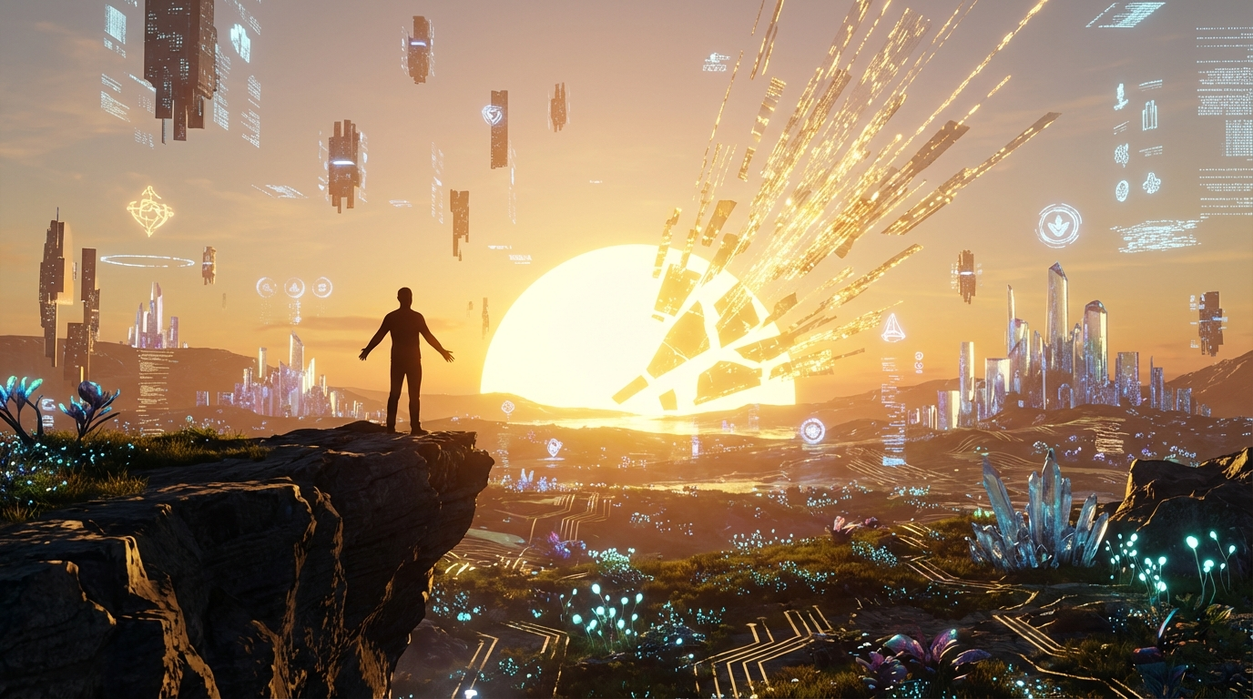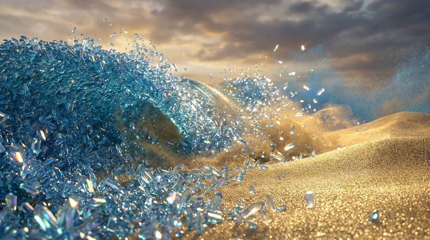 Prompt: A cinematic wide shot of a giant wave made of blue crystals crashing onto a beach made of gold dust. The crystals shatter realistically upon impact, scattering light in all directions. Slow motion, high frame rate, physics simulation, photorealistic.
