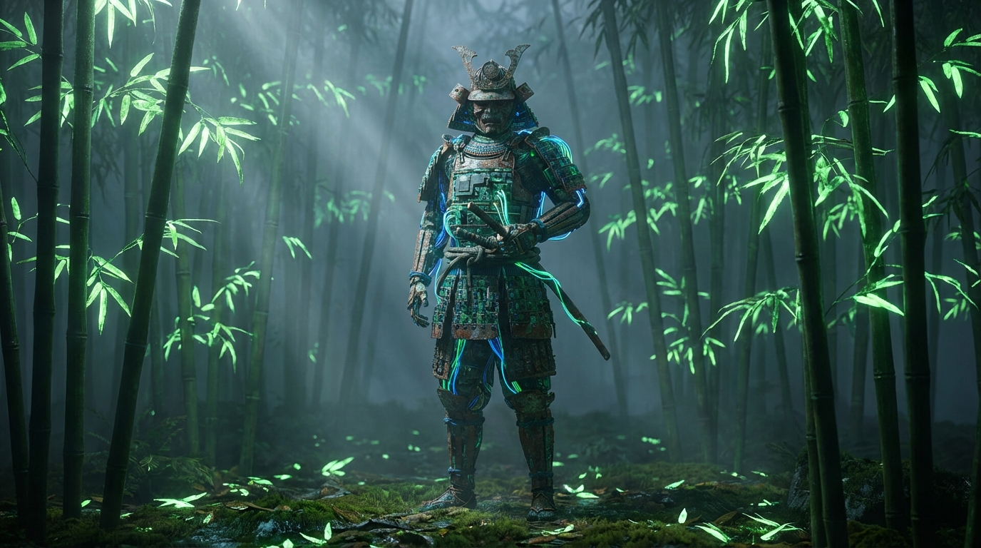Prompt: A hyper-realistic portrait of an ancient samurai warrior made of circuit boards and fiber optics, standing in a misty bamboo forest. The bamboo leaves are glowing neon green. Cinematic lighting, volumetric fog, 8k resolution, intricate details, unreal engine 5 style.