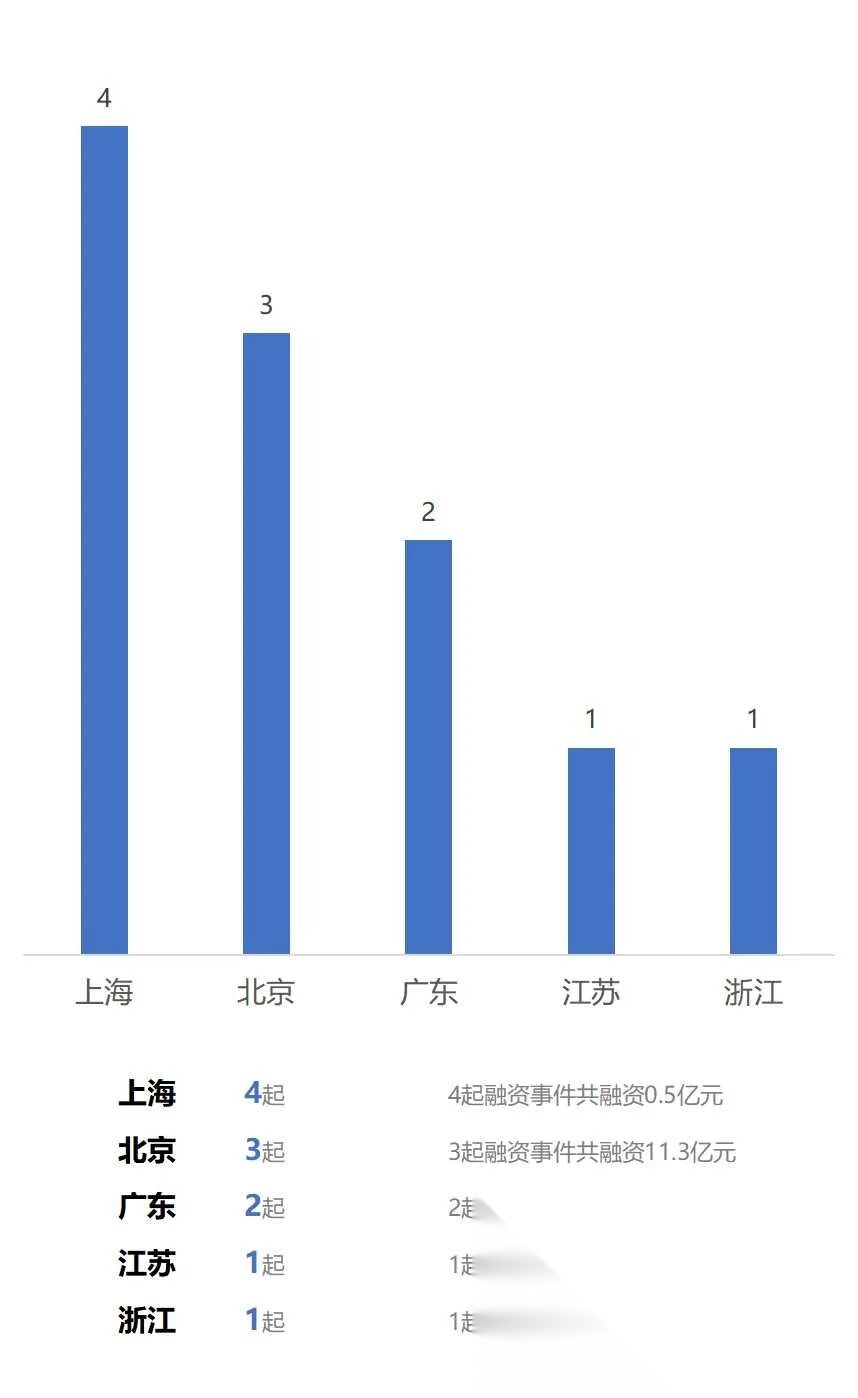 从本周国内披露获投AI企业的地区分布来看,主要集中在上海、北京、广东、江苏、浙江,其中上海披露4起,北京披露3起,广东披露2起,江苏、浙江均披露1起。