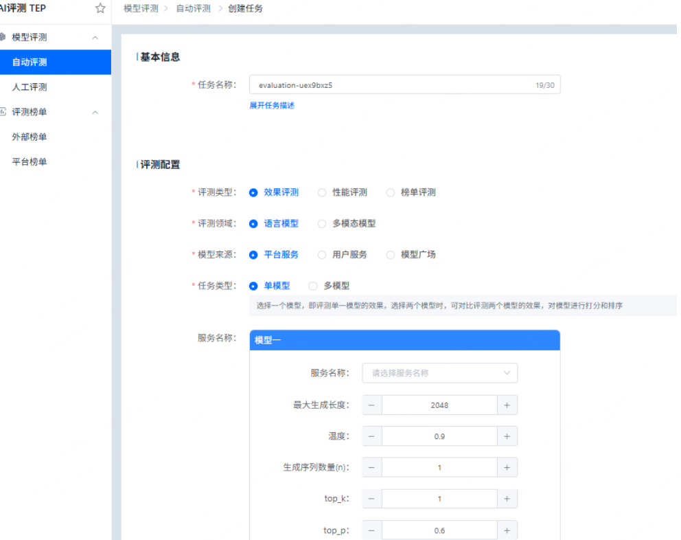 用户只需要简单的进行配置即可创建评测任务,如下图: