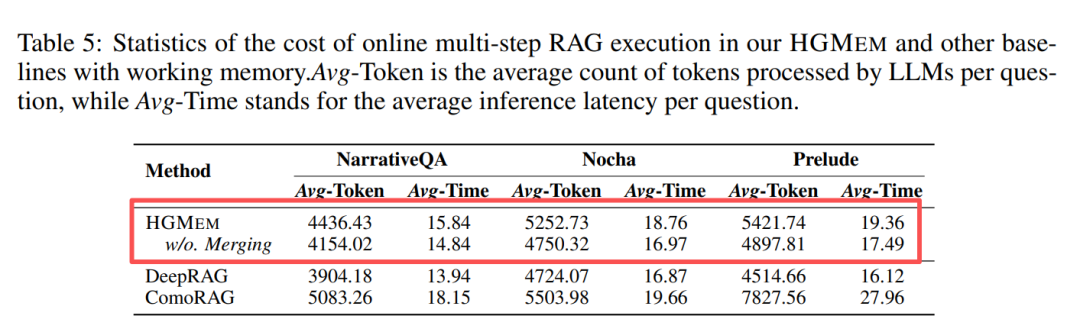 与同样带工作记忆的 DeepRAG / ComoRAG 相比,HGMEM 平均 token 消耗与延迟几乎持平,并未因“超图”而额外增负: