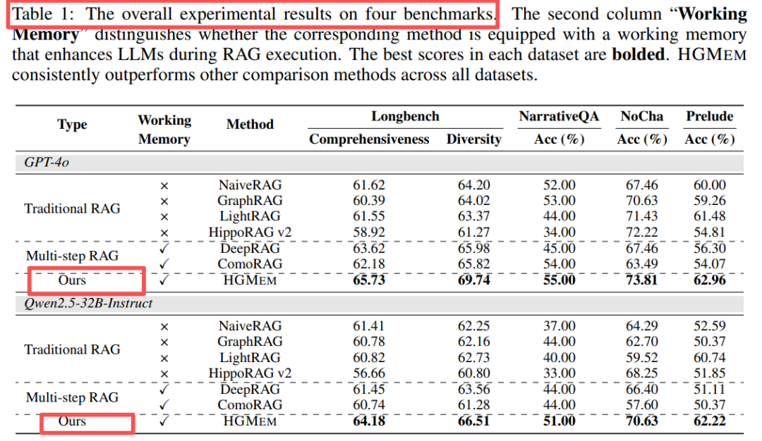 在 4 个超长文档基准(NarrativeQA / NoCha / Prelude / LongBench-V2)上,同样用 GPT-4o 或 Qwen-32B 做 backbone,HGMEM 全线 SOTA: