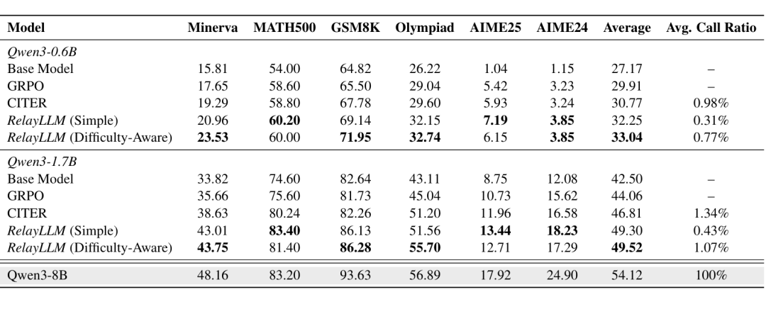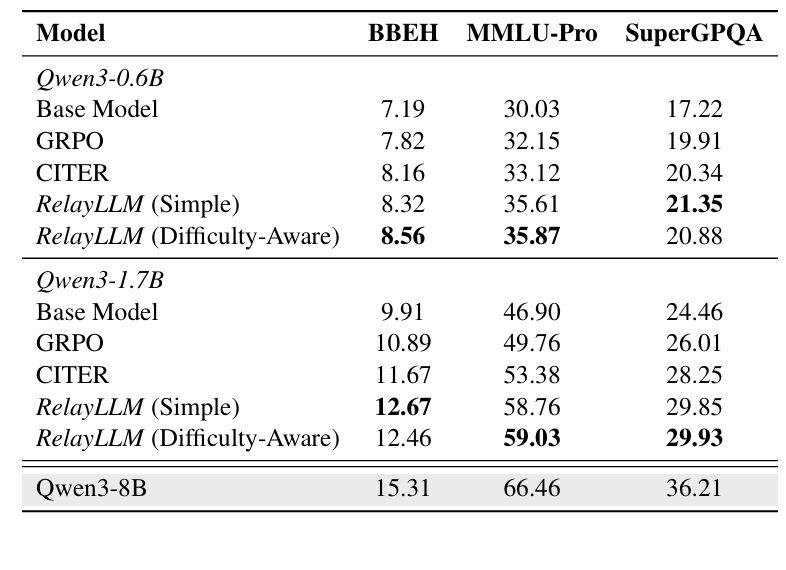 - 相比 GRPO 基准(标准强化学习训练),RelayLLM 全面领先