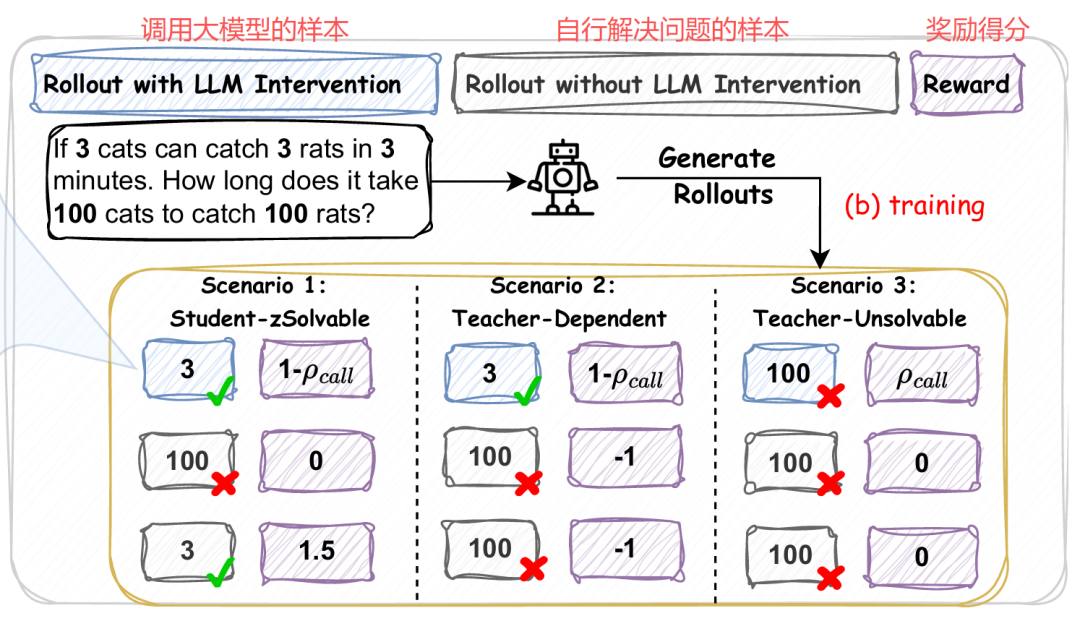 其中 ρ(y) 是调用比率(大模型生成的 token 数 / 总 token 数)。这个奖励鼓励准确率,同时惩罚过度调用