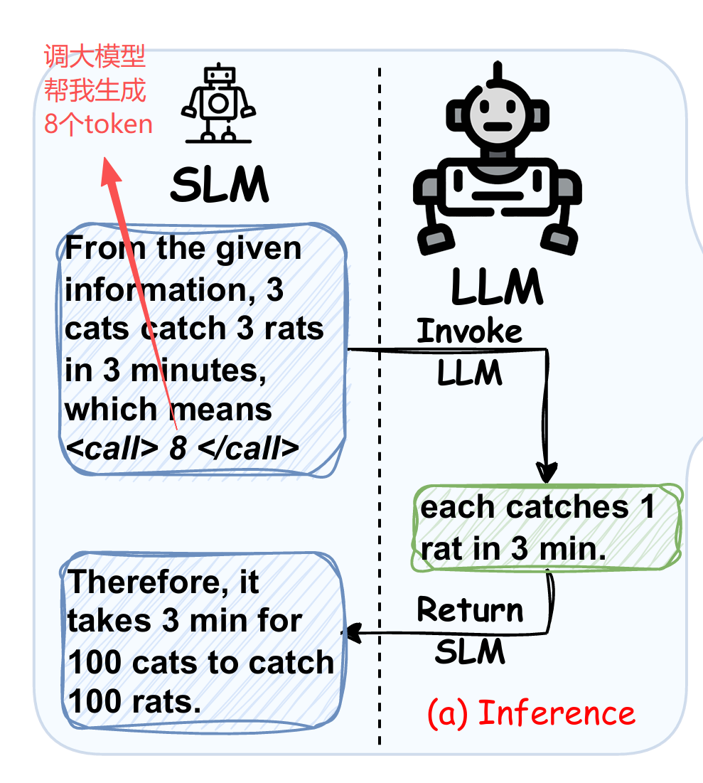 默认情况下,小模型 M_S 正常进行自回归生成。但它被赋予了一项特殊能力:可以生成一个命令 token: