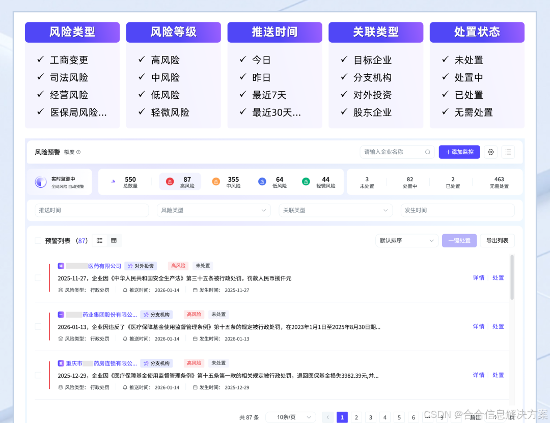 区别于通用合规工具,深度贴合医药行业监管规则,专门定制医保局失信、商业贿赂等核心风险维度,精准捕捉行业专属合规红线,解决传统工具对医药特殊合规需求覆盖不足的问题。