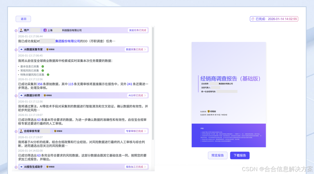 采用“算法-AI-专家”协同模式,合规人员可上传辅助材料补充数据,系统通过算法与AI自动完成数据采集、处理,再由合规专家复核,对高危、疑难案例最终研判,兼顾效率与精准度。系统基于全流程数据自动生成尽调报告,最快次日交付,支持复用标准化模板或定制个性化模板,满足不同场景尽调需求,且所有数据与判断依据可追溯,适配内外部审计与合规留痕要求。