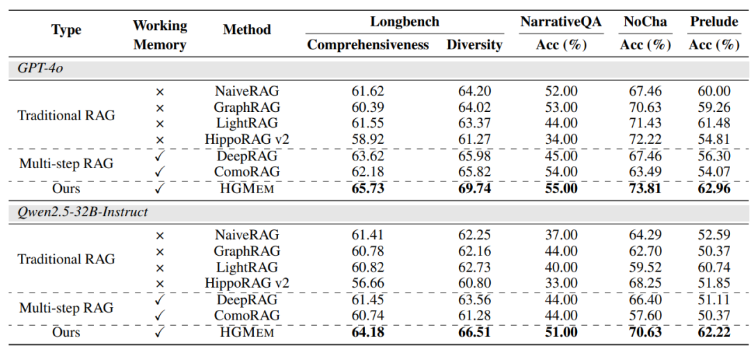 特别值得注意的是,基于开源模型Qwen2.5-32B的HGMEM甚至优于使用更强GPT-4o的基线方法,证明了该方法在资源效率方面的价值。