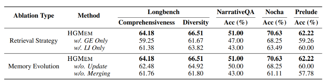 - 对于原始查询,两种方法性能相当,说明HGMEM不会过度复杂化简单问题