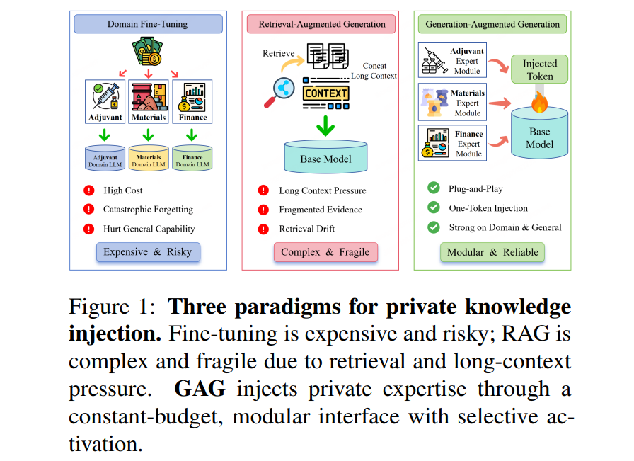 来自中科院和360AI的联合团队,把私有知识看成一种新模态,借鉴多模态 LLM 的“对齐-融合”思路,提出无需检索、固定底座、单 Token、即插即用的第三代方案——GAG。