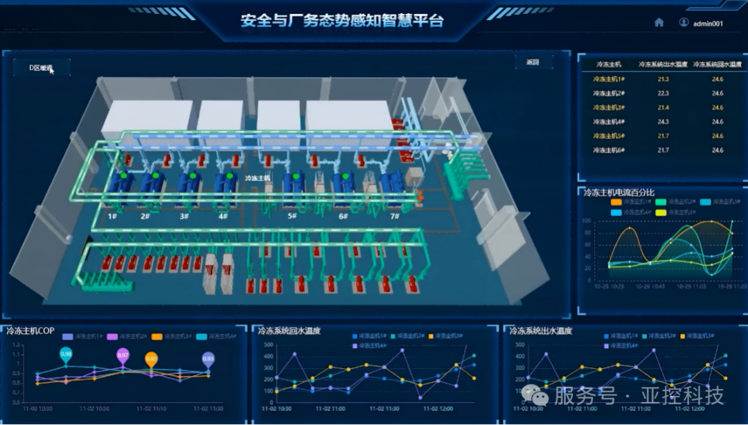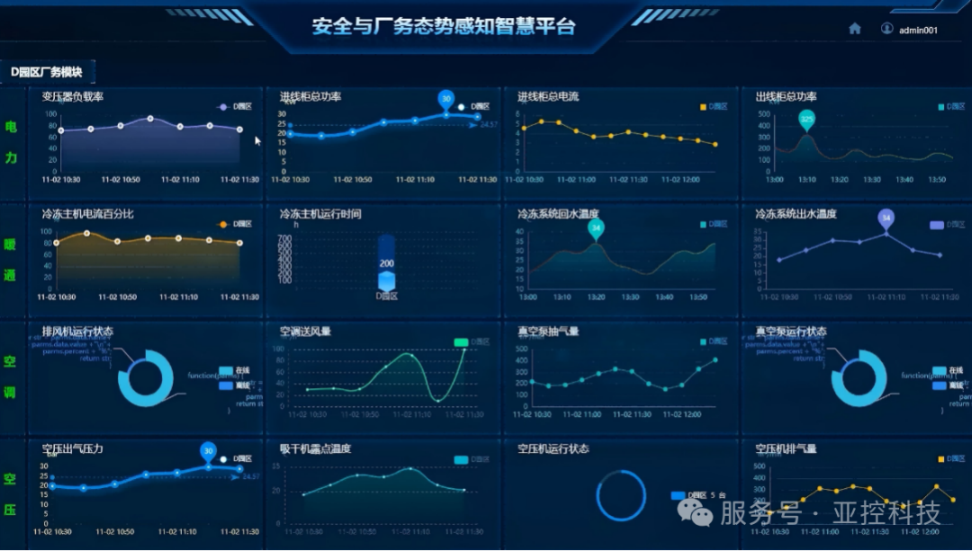 集中管控电力、冷冻、暖通、空压四大核心模块,实时呈现变压器负载率、冷冻主机电流百分比、空调送风量、空压机出气压力等关键参数的变化趋势,全面掌握厂务设备运行状态,为设备运维提供数据支撑。