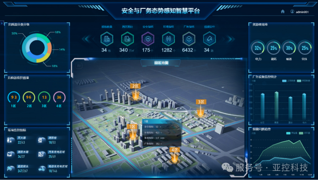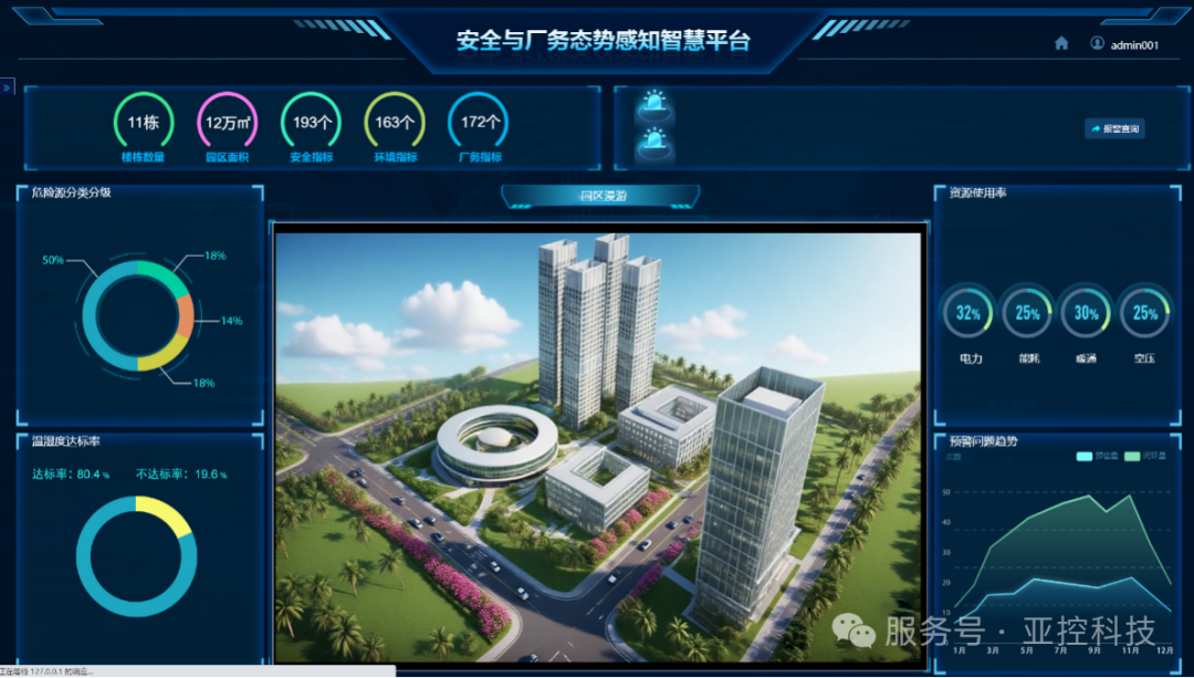 作为园区管理的“总控制台”,整合全区基础数据总览(楼栋数量、园区面积等)、危险源分类分级、分区设施运行统计、资源实时使用率、厂务设备监控及多类预警信息,让管理人员一键掌握园区整体运行态势,实现全局统筹管理。
