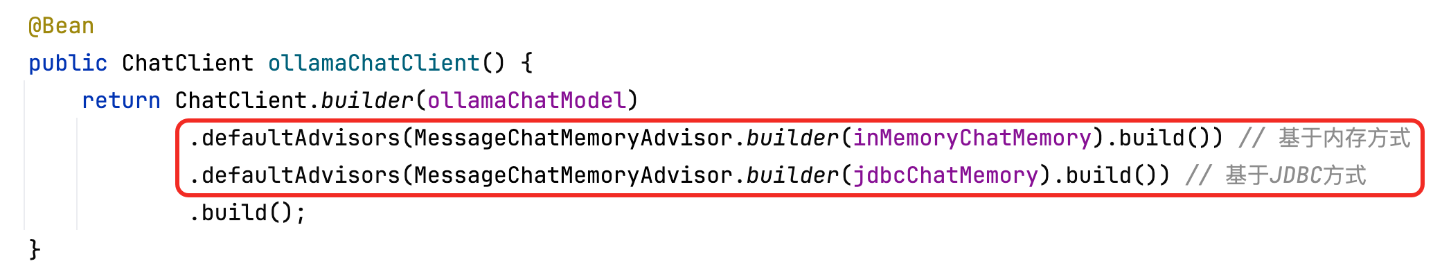 MessageChatMemoryAdvisor(jdbcChatMemory)) // JDBC⽅式