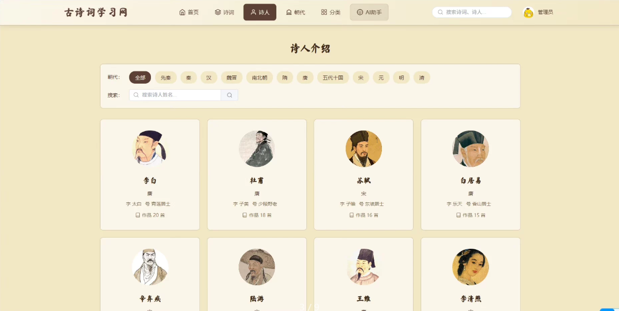 诗人浏览模块(诗人列表、诗人详情、生平简介、代表作品)