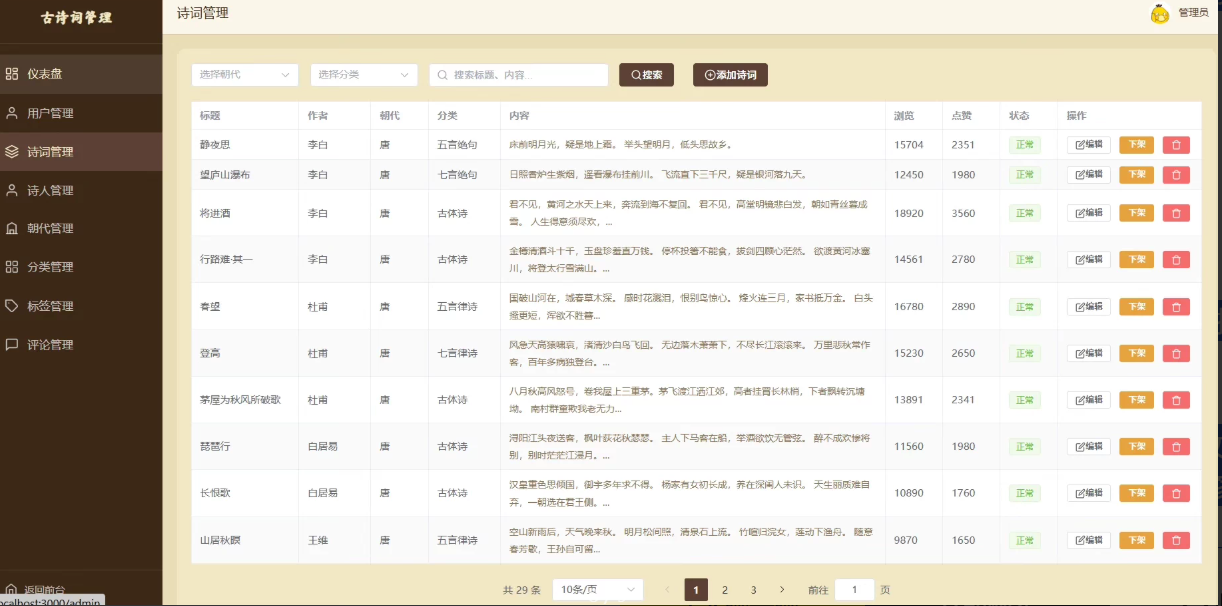 诗词管理模块(增删改查、批量删除、状态管理、标签管理)