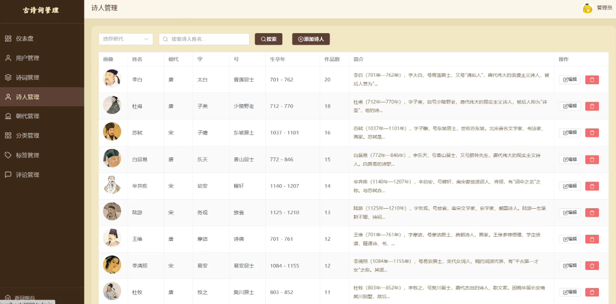 诗人管理模块(增删改查、画像上传、生平简介编辑)