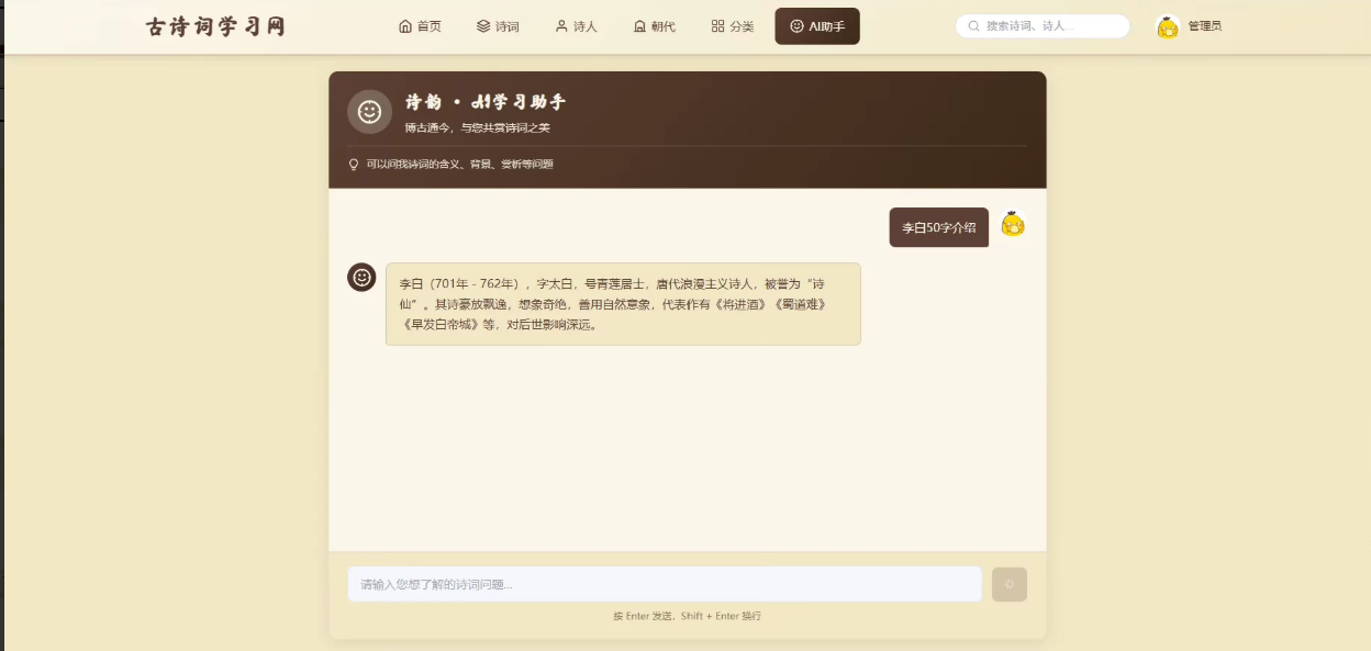 AI学习助手模块(流式对话、诗词赏析问答、诗人介绍、诗词知识讲解)